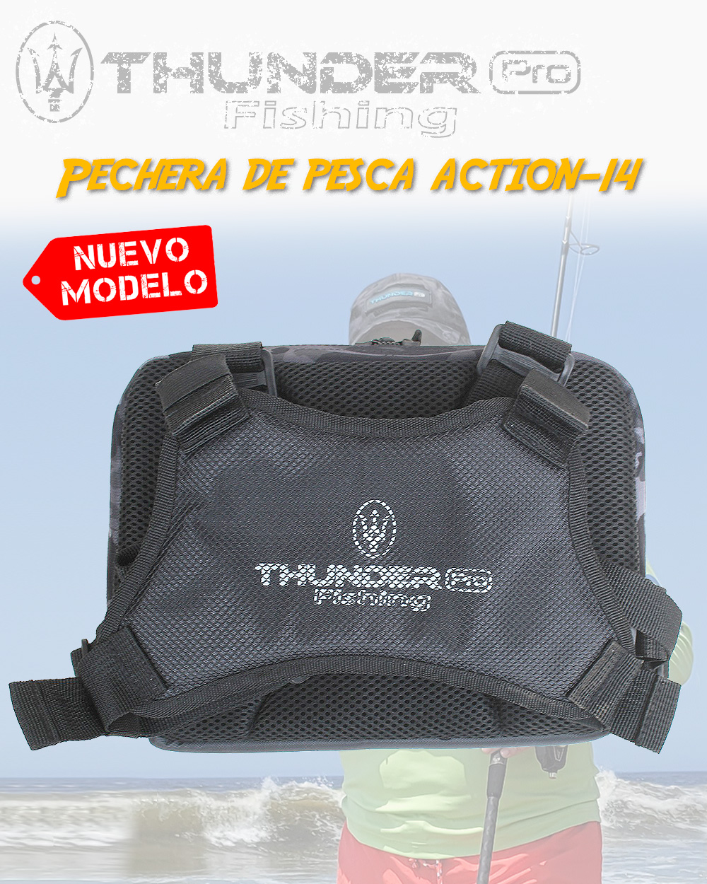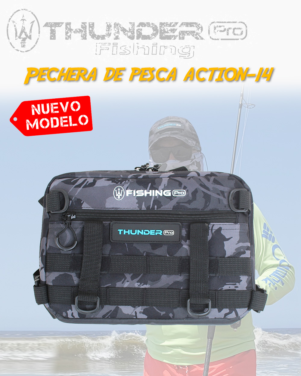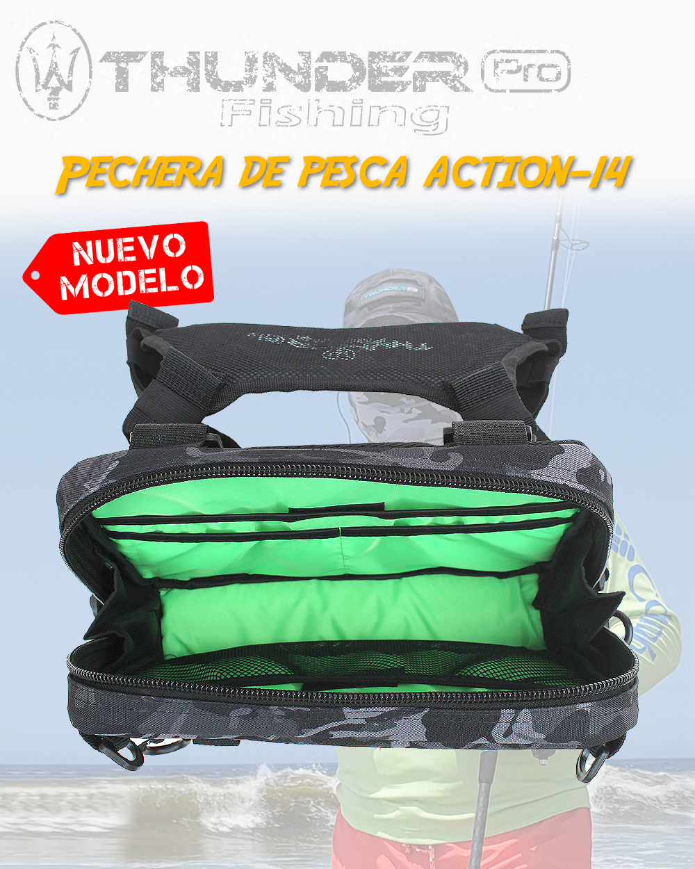 La NUEVA Pechera de pesca CHEST BAG CAMO 14 de THUNDER PRO™ FISHING, ha sido diseñada para que el pescador deportivo puede disponer de sus señuelos, armadas y otros accesorios cuando pesca en la orilla, ahorrando mucho tiempo para hacer los cambios...